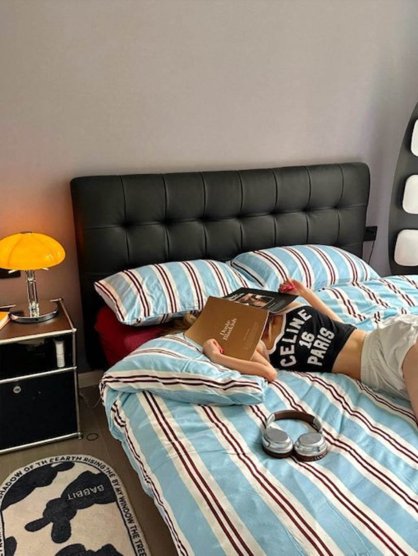 Come with 1 duvet cover, 2 pillowcases & 1 fitted sheet, this retro striped bedding set is crafted for both comfort and style. Featuring iconic blue stripes, this retro-inspired elegant bedding set would add a touch of nostalgia charm to your bedroom. Purely constructed with organic cotton, it would wrap you in cozy comfort like a warm gentle hug and offer a soft luxurious feel for a restful sleep.