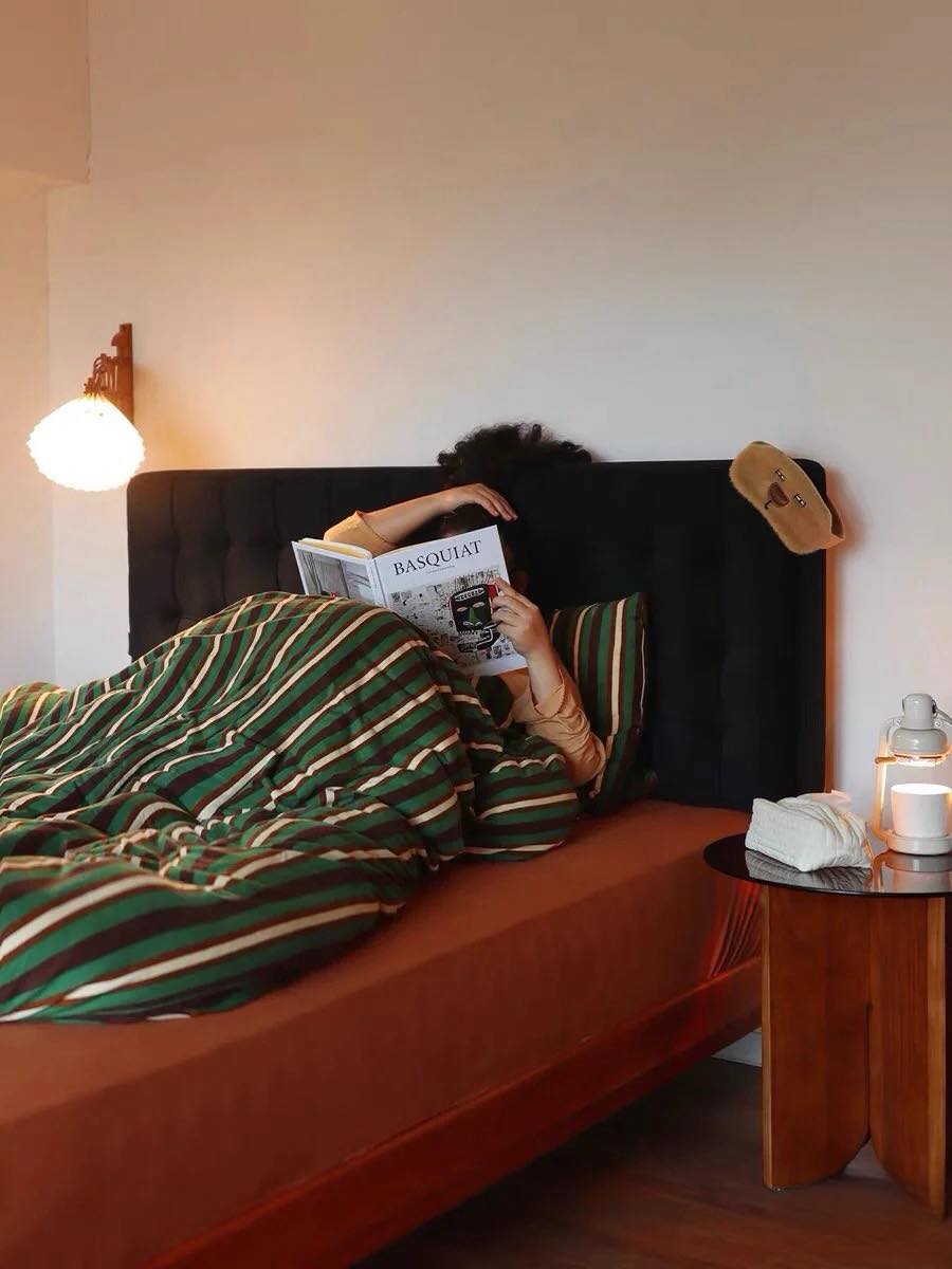 Come with 1 duvet cover, 2 pillowcases & 1 fitted sheet, this retro striped bedding set is crafted for both comfort and style. Featuring earthy tone stripes, this retro-inspired elegant bedding set would add a touch of nostalgia charm to your bedroom. Purely constructed with organic cotton, it would wrap you in cozy comfort like a warm gentle hug and offer a soft luxurious feel for a restful sleep.